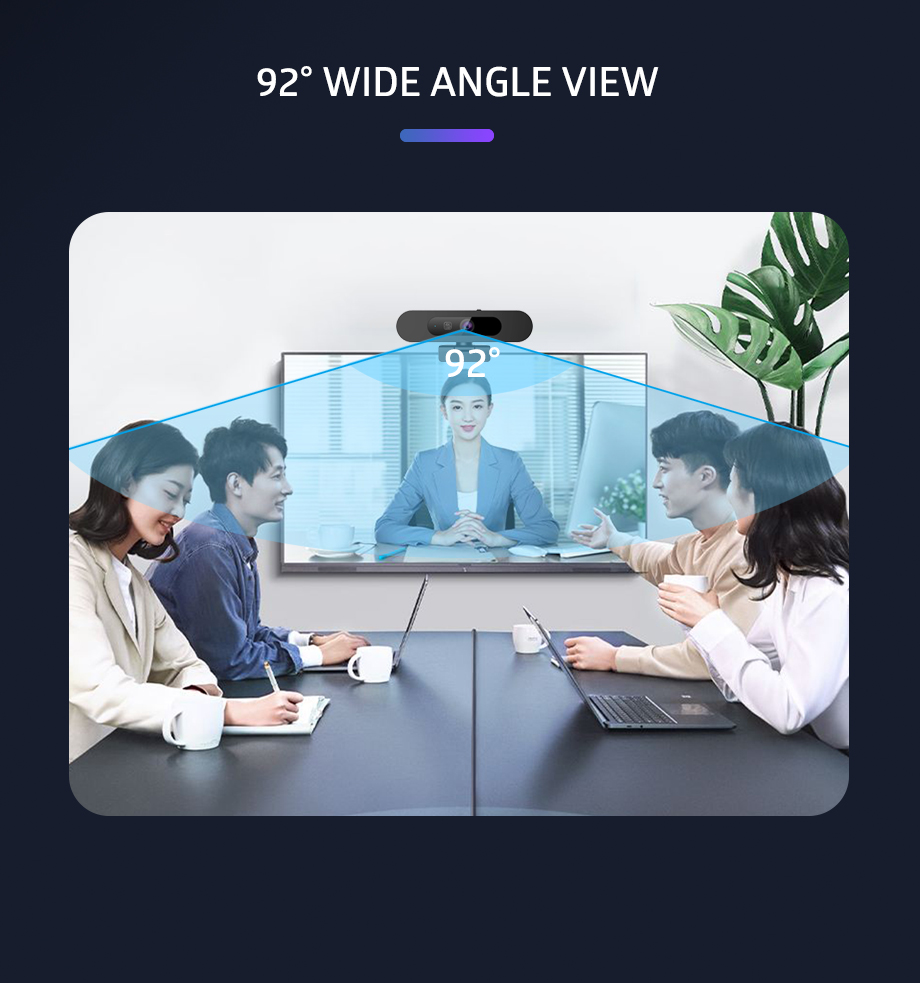 A 92° wide field of view (FOV) lens effortlessly captures wide scenes and multiple participants, perfect for team meetings and group chats.