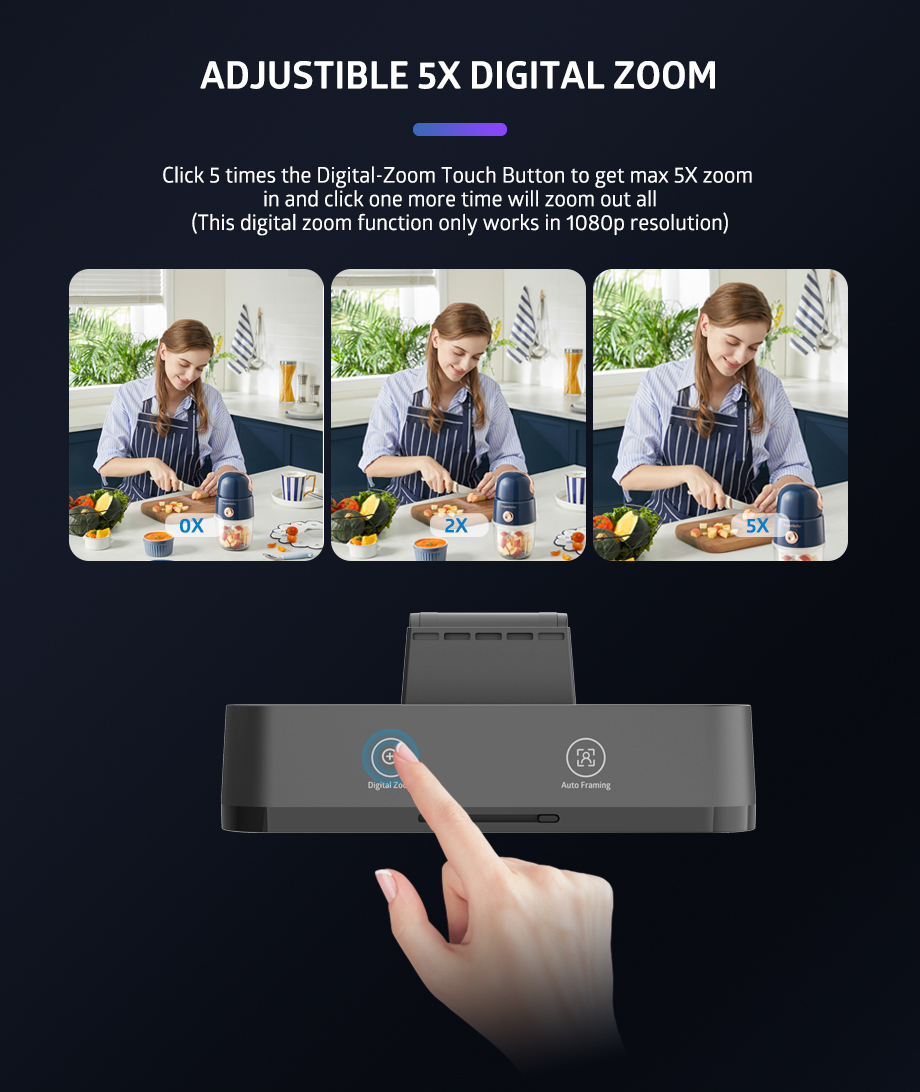 With 5X digital zoom, you can easily achieve close-up shots, capturing more details. Whether you're showcasing products or giving detailed explanations, this webcam meets your needs.