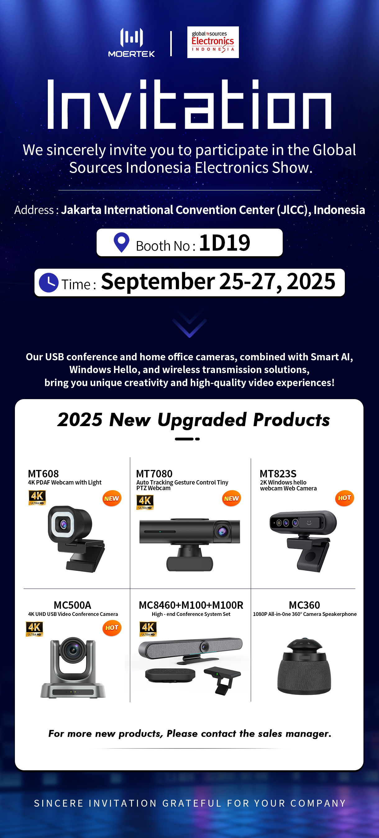 Moertek will be showcasing its latest audio and video solutions at Global Sources Electronics Indonesia 2025, from September 25–27 at the Jakarta Convention Center, Booth 1D19. Featured products include the 4K PTZ Conference Camera, All-in-One Video Bar, AI Dual-Lens Auto-Framing PTZ Camera, and Multi-Lens AI Area Tracking PTZ Camera with SDI. These innovations are designed for video conferencing, education, live streaming, and professional broadcasting. Visitors are welcome to experience live demos and explore collaboration opportunities with our team.