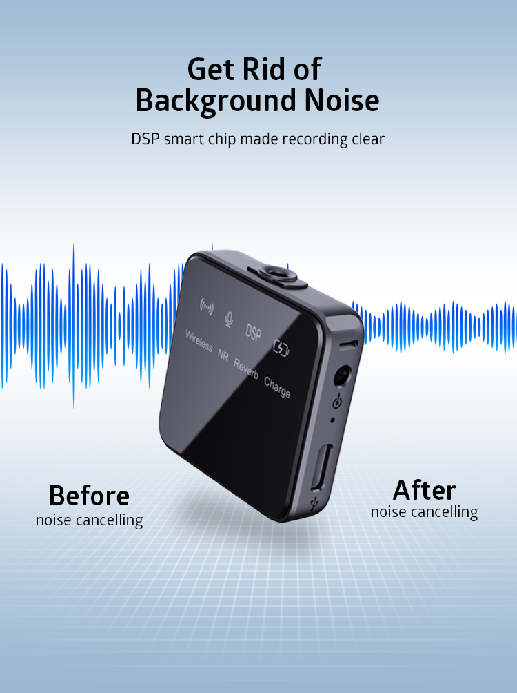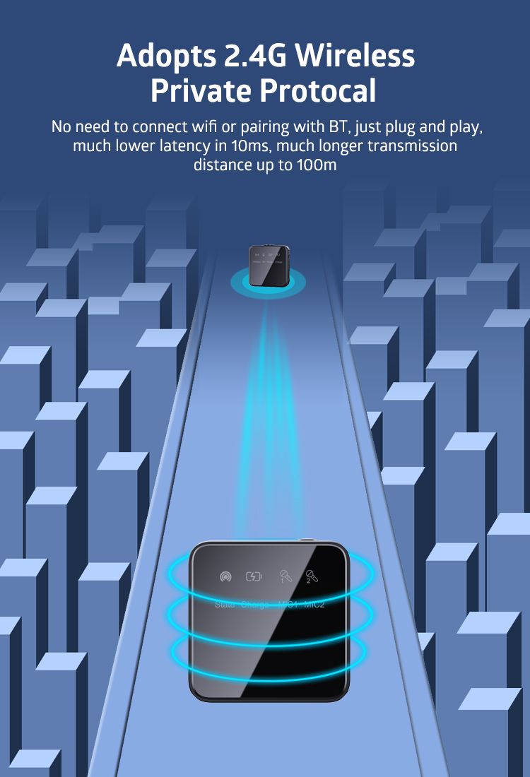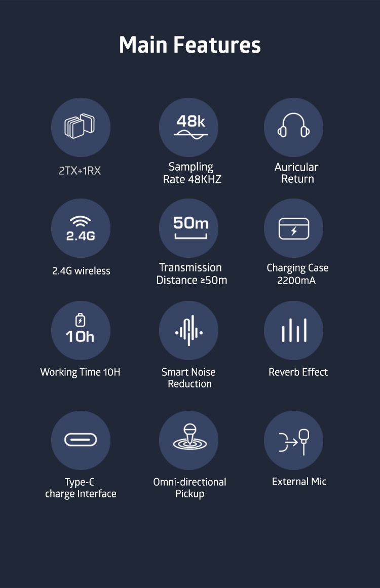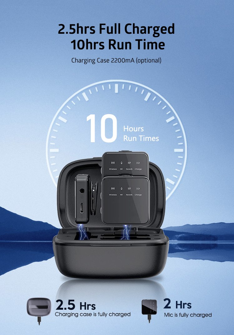 • Two transmitters and the receiver are pre-linked, charged, securely stored in the charging case.